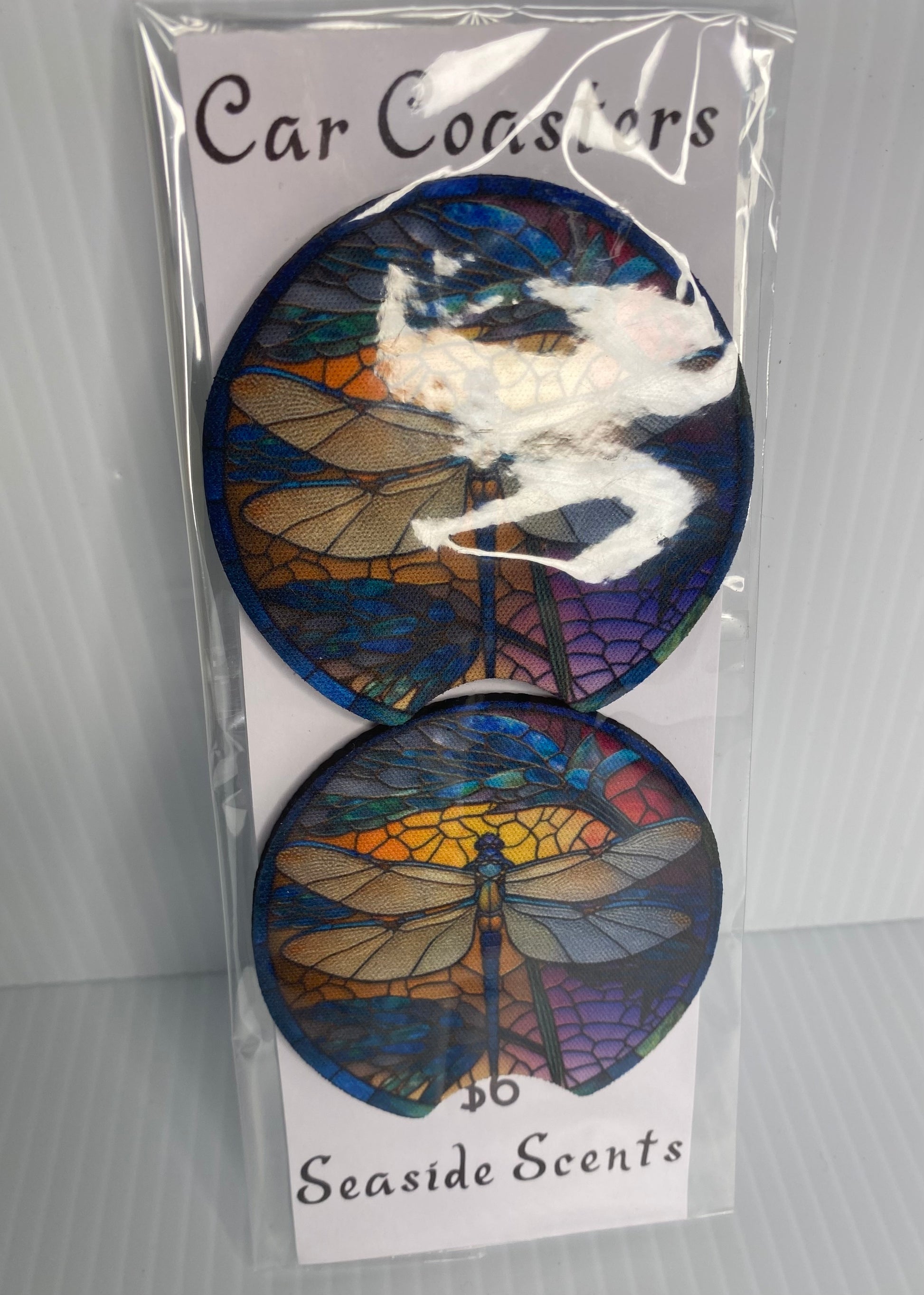 Add a touch of whimsy to your car with these Stained Glass Dragon Fly on a coaster not only protects your cup holders, but also adds a cheerful vibe to your daily commute. Comes in a pack of 2.